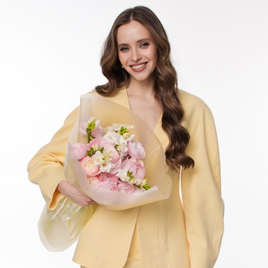 Букет 21 розовый ранункулюс — это символ утончённости, нежности и элегантности. Пышные бутоны ранункулюсов с множеством лепестков создают эффект воздушного облака, а мягкий розовый оттенок придаёт композиции романтичность и изысканность. Дополняющая фрезия наполняет букет лёгким ароматом и делает его ещё более выразительным. Такой подарок станет прекрасным выбором для любимой, мамы или подруги и поможет передать самые тёплые чувства.