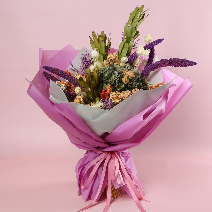 Леукадендрон, гортензия, роза, статица, чумиза, нигелла, овес, сухоцвет микс