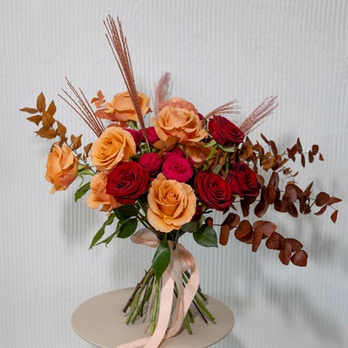 Роза Черри Трендсетер – 3 шт, роза Моаб – 7 шт, роза Гран При – 5 шт, эвкалипт стабилизированный, мискантус