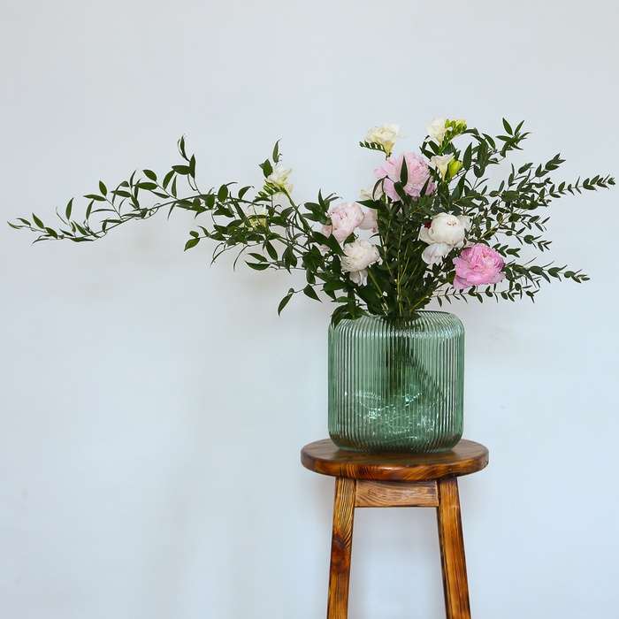 Ваза 25*25*15 см, пион микс – 7 шт, фрезия – 5 шт, рускус – 2 ч, эвкалипт парвифолия – 1 ч