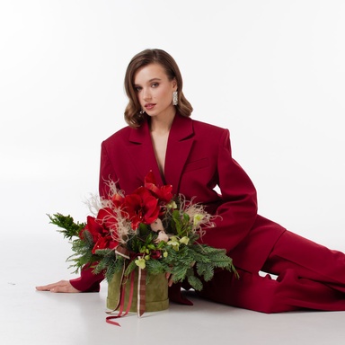Натуральная хвоя - 2 шт, амариллис - 2 шт, коробка, криптомерия - 1 шт, туя - 2 шт, хелеборус - 2 шт, стифа - 3 шт, декор птица - 2 шт.