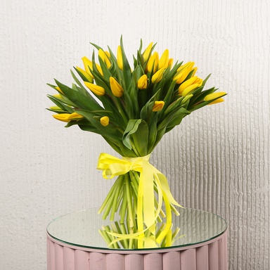 Подарите солнечное настроение вместе с букетом 35 жёлтых тюльпанов — пусть каждый цветок расскажет о ваших искренних чувствах.