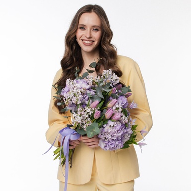 Найніжніший і ароматний букет з троянд, весняних тюльпанів, бузку та ароматної фрезії, яка підкорить своїм запахом!