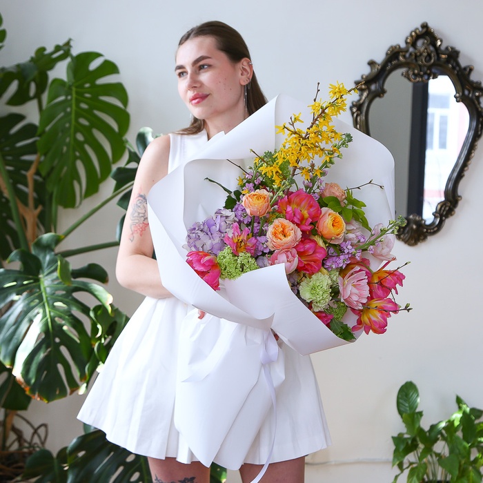 Тюльпан дабл - 13 шт, вібурнум - 3 шт, гвоздика - 3 шт, ранункулюс - 3 шт, троянда Сент Пітерспарк - 5 шт, матіола - 3 шт, форзіция - 1 шт, гортензія - 2 шт, чойсія - 2 шт