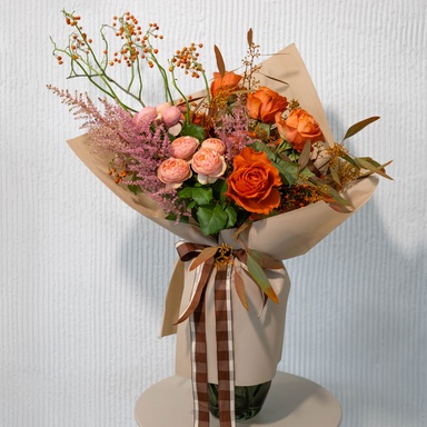 Троянда Корал Експрешен - 7 шт, астільба - 3 шт, росса корало - 1 шт, евкаліпт, троянда Світ Трендсеттер - 2 шт