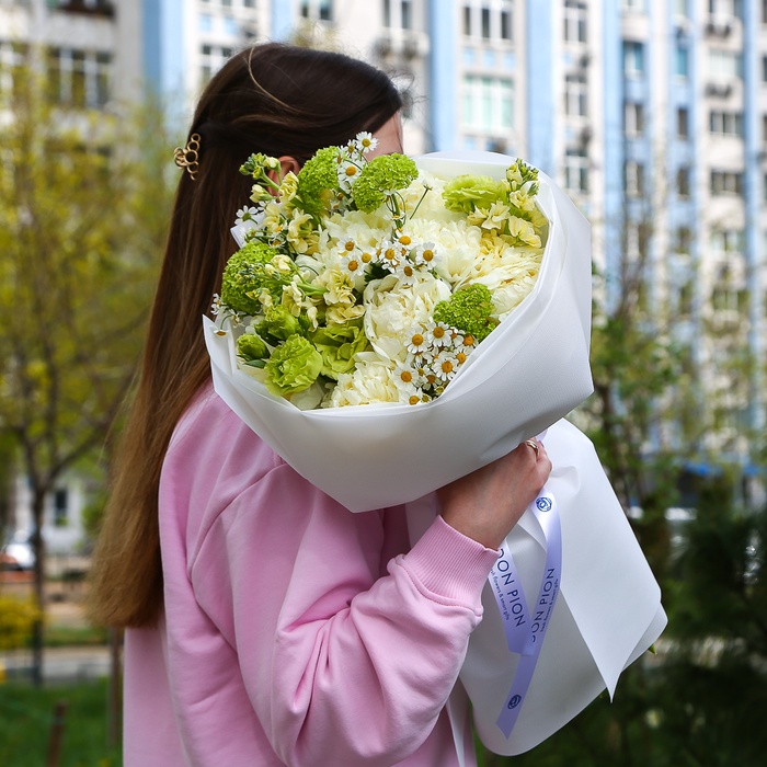 Букет з півоніями, ромашкою, матіолою, еустомою «Свіжий подих» — це ніжна та природна композиція, яка дарує відчуття легкості й гармонії. Білі півонії надають букету об’єму та витонченості, ромашки додають щирості й простоти, створюючи атмосферу затишку. Лимонна матіола наповнює композицію легким ароматом і сонячними нотками, а зелена еустома підкреслює свіжість і сучасний стиль. Разом ці квіти утворюють гармонійний, повітряний букет, який виглядає природно та дуже ніжно.