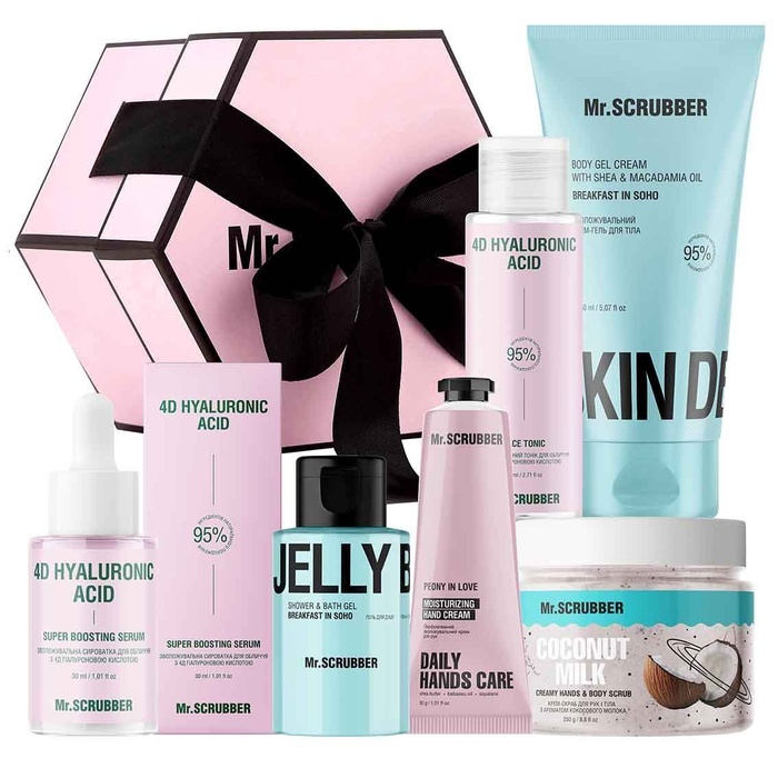 Подарунковий набір в розкішній коробці зі стрічкою створений для того, щоб дарувати настрій, приємні емоції і найніжніших догляд Mr.SCRUBBER. Спеціально підібрані засоби забезпечують комплексний догляд за тілом і обличчям, роблять подарунок бажаним і приємним до будь-якого свята.